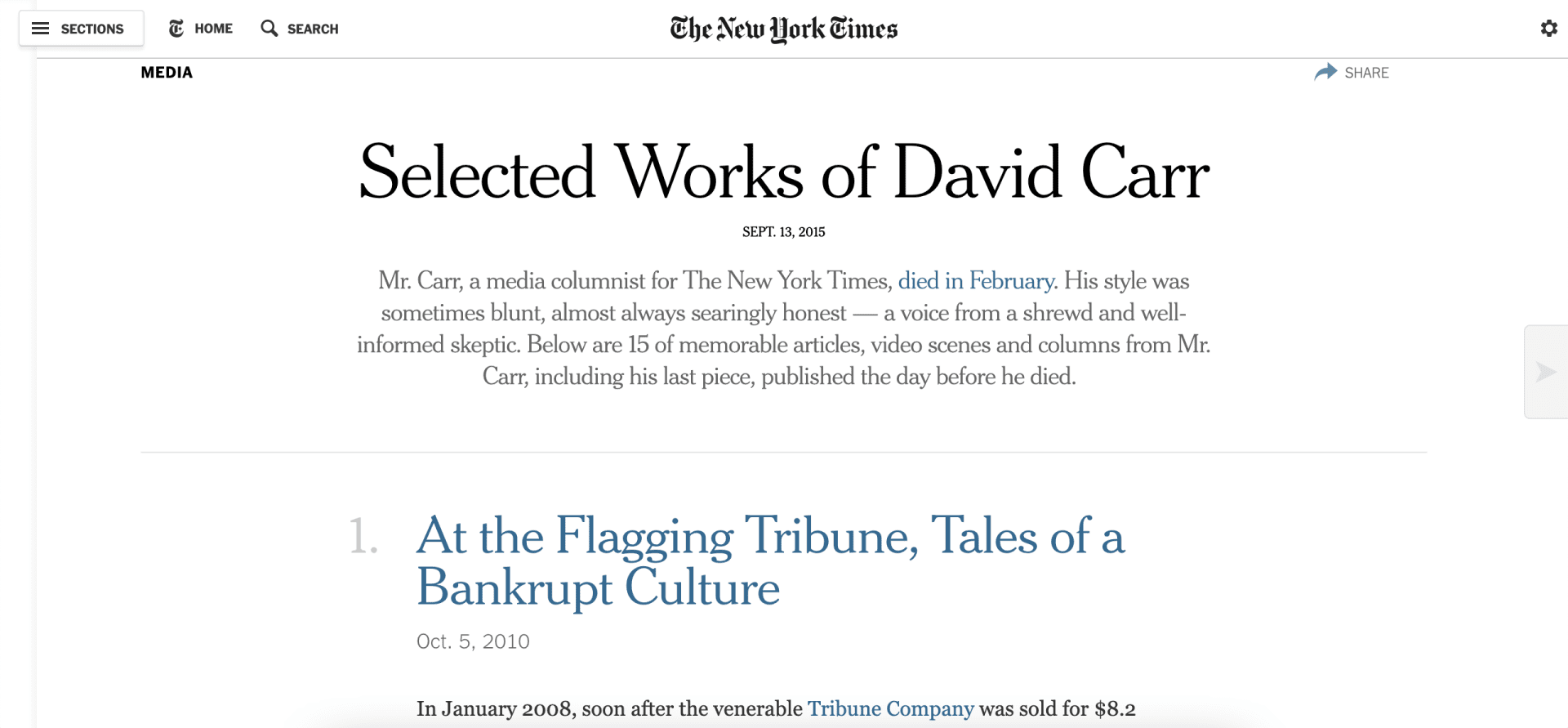 This week, I read through the late David Carr’s articles. After reading through a decent amount of what was available on the New York Times, I selected two to write about; King of Their Crafts, but on Divergent Paths and At Front Lines, Bearing Witness in Real Time.
